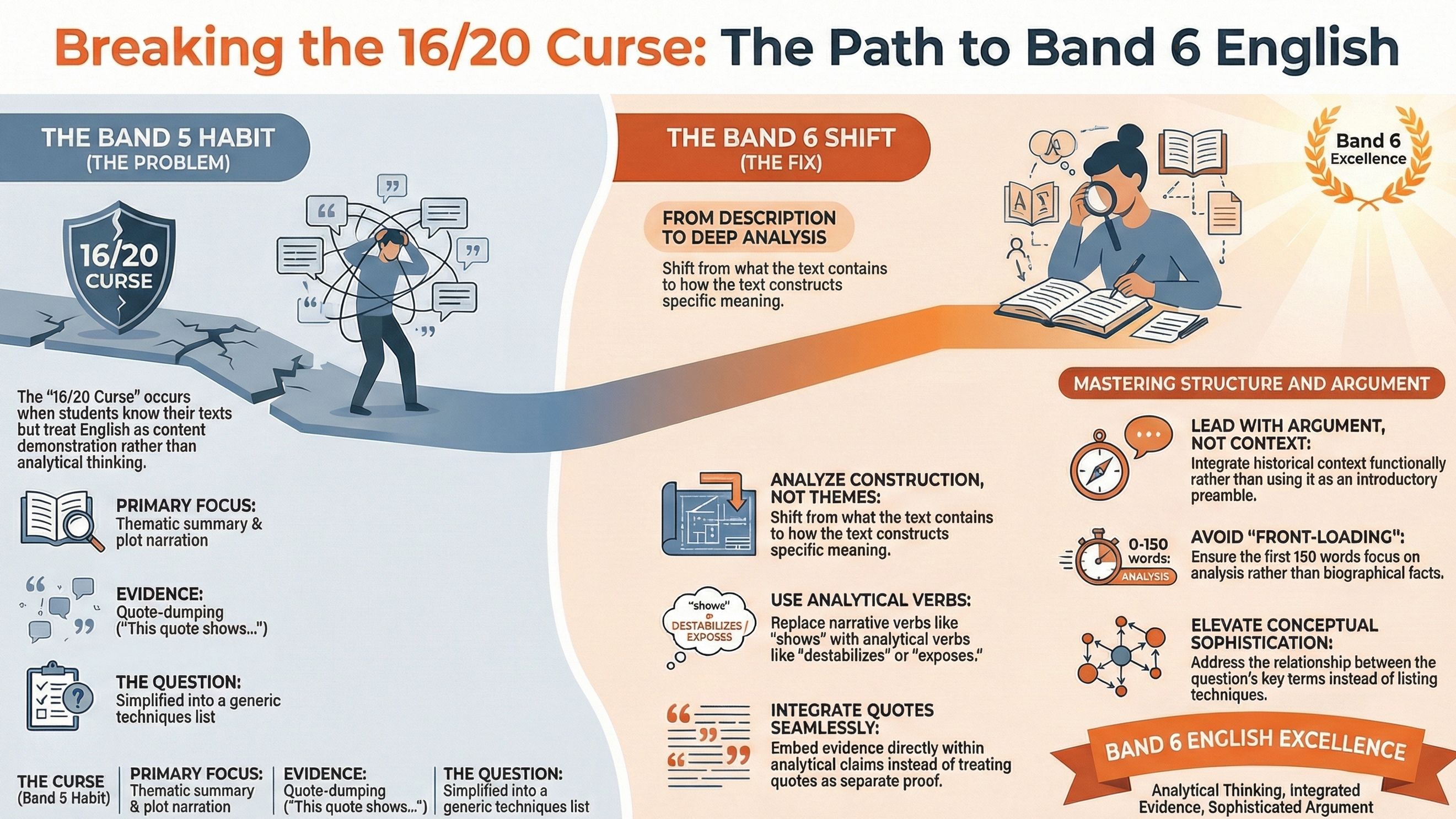 These aren't six random errors. They're six versions of the same problem: treating English as content demonstration rather than analytical thinking. Band 5 students prove they've read the text. Band 6 students prove they can analyze how texts create meaning.